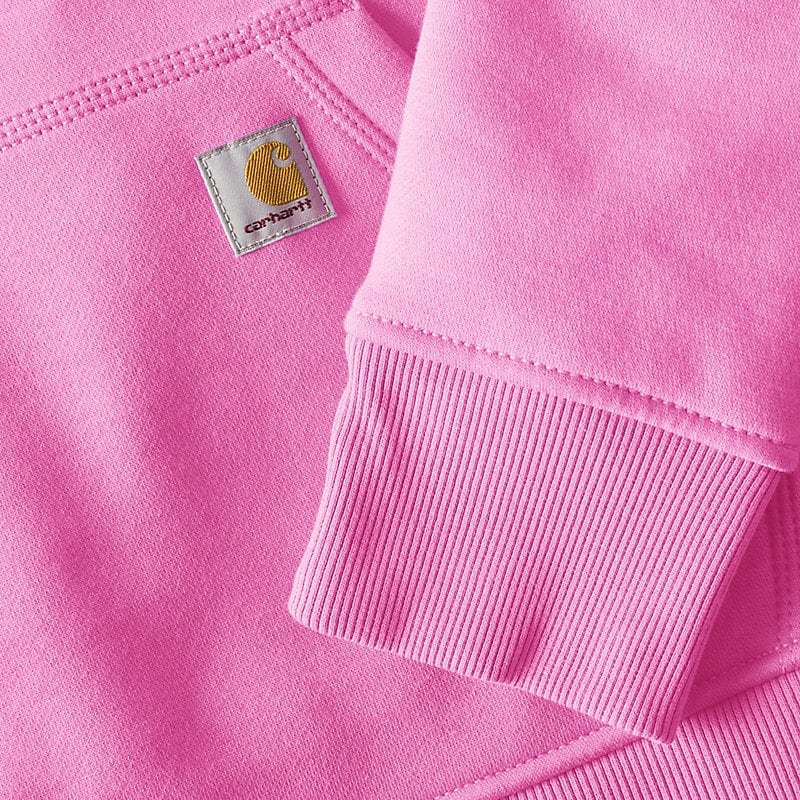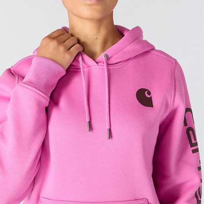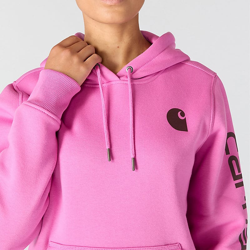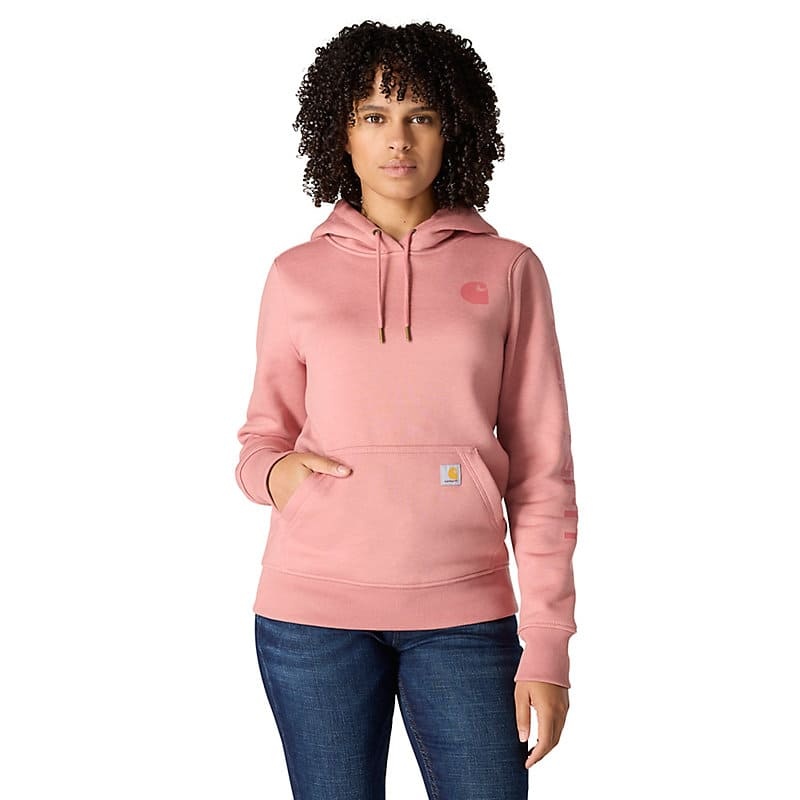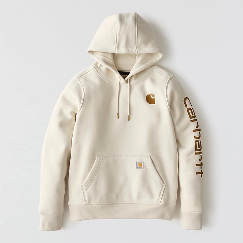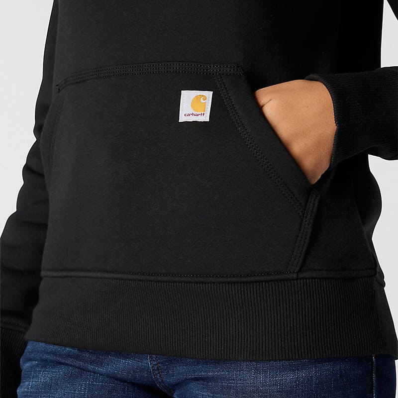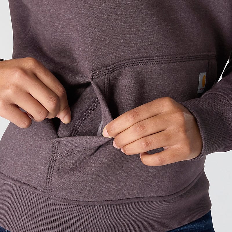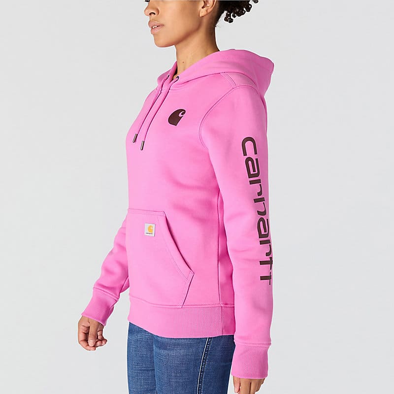 Cold winter mornings are a lot more comfortable with this women's cozy hoodie. Made of heavyweight fleece, the sweatshirt is brushed on the inside for extra softness. It has a relaxed fit that allows for easy layering, and it's finished with a Carhartt logo down the sleeve.