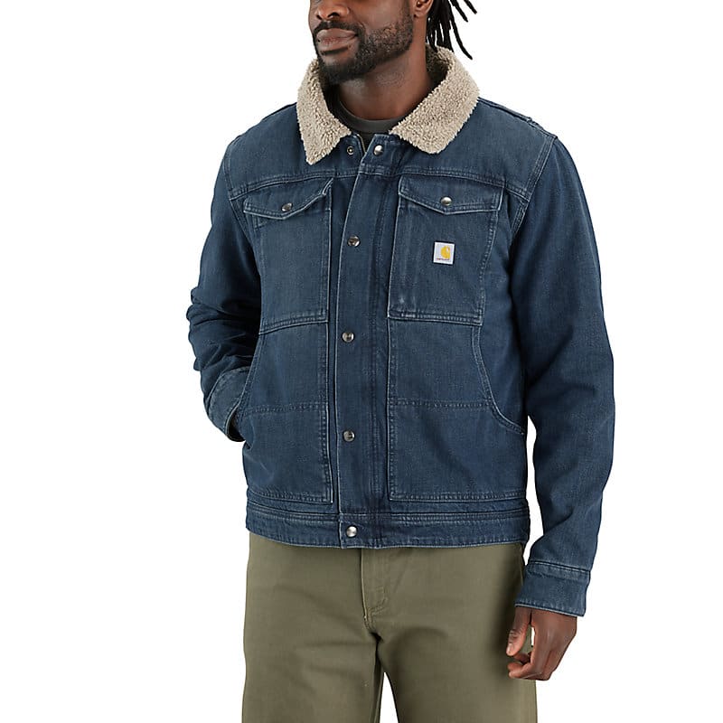 Cool weather won't slow you down in this men's denim jacket. A relaxed fit and pleated back offer room to move while setting up equipment on the job or doing weekend chores. It's lined with sherpa fleece for added warmth. Pockets inside and out add plenty of storage.