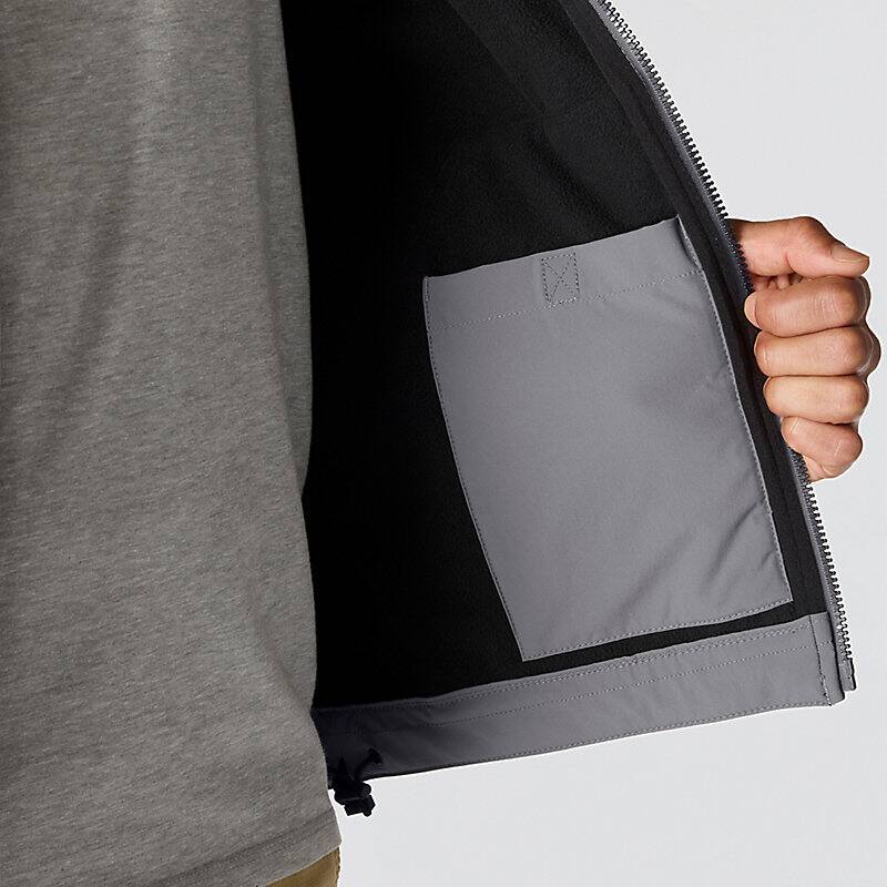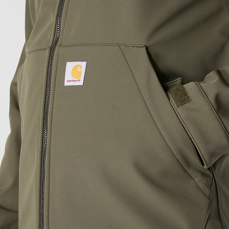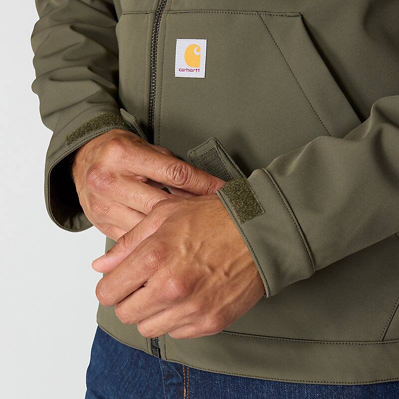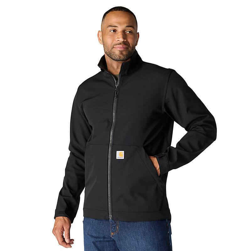 Keep working through gray, cloudy days in this men's softshell water-resistant jacket. It's made to repel light rain and fight off gusts of wind. It has built-in flex so you can move without restriction, and a mock-neck collar for a little extra coverage. A relaxed fit gives you room to move.