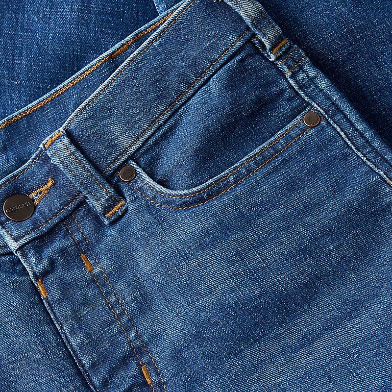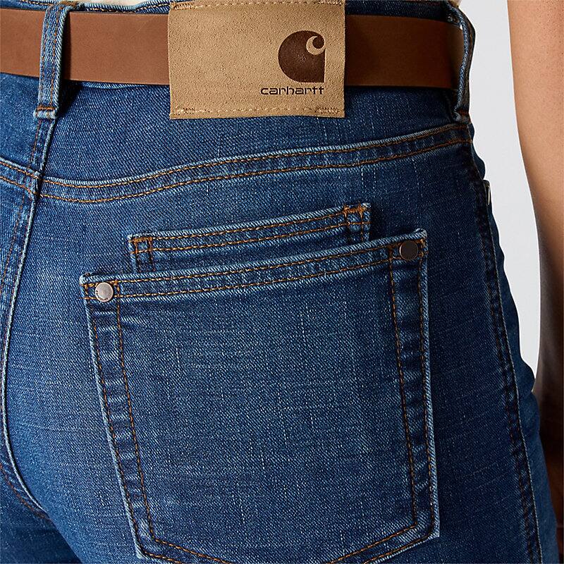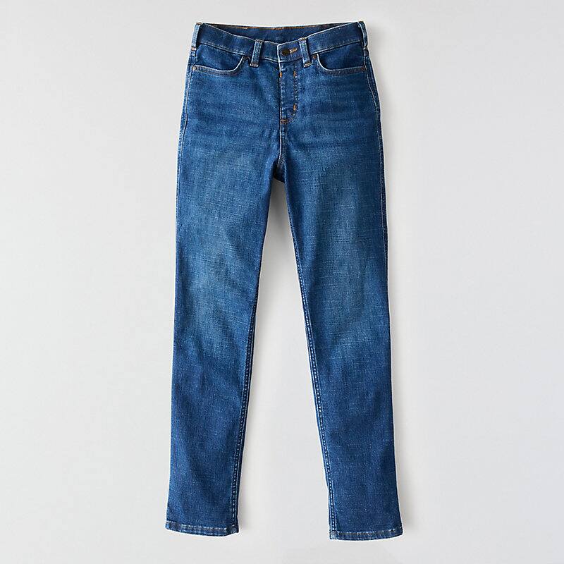 - Durable stretch denim moves, bends, and bounces right back