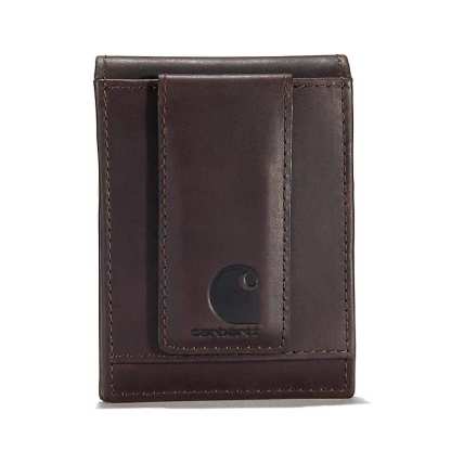 This men's wallet has a simple, old-school design. It's made of durable full-grain leather with a rich oil finish that has a slight shine. An embossed Carhartt logo is its seal of quality.