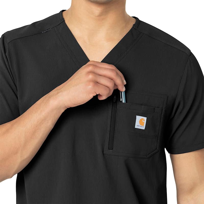 Stay connected and ready for the demands of your shift in this men's tuck-in V-neck scrub top. The nylon/spandex blend is built for mobility and eco-friendly durable water repellency. Easy access triple chest pocket with zipper and hook-and-loop closures keep items close.