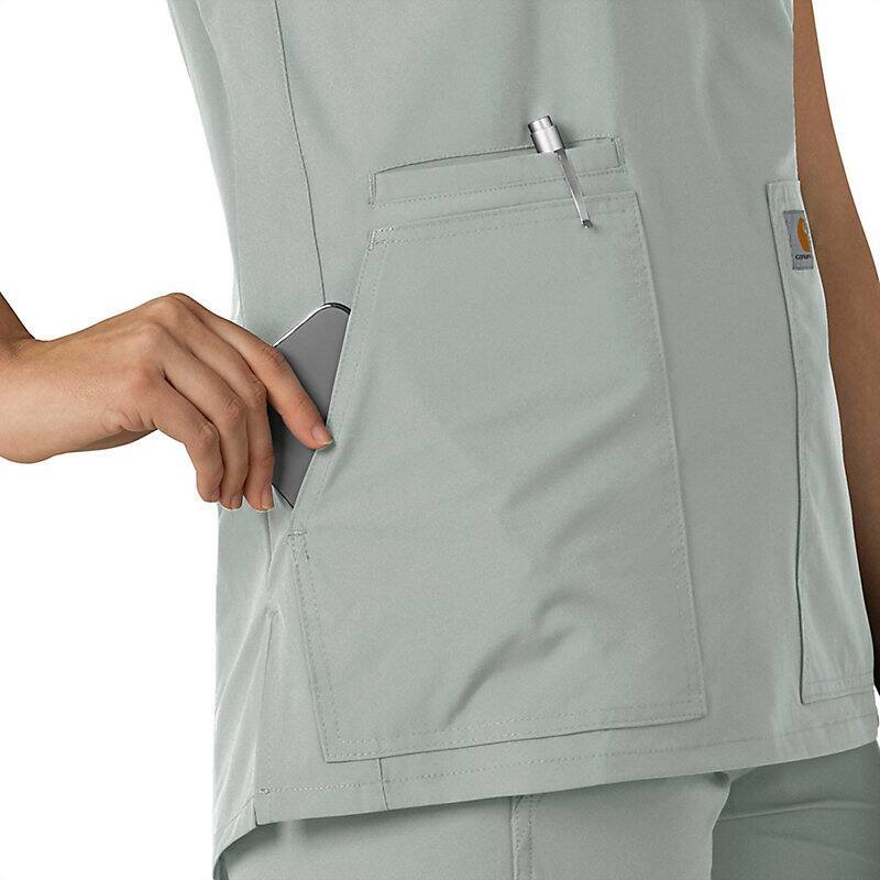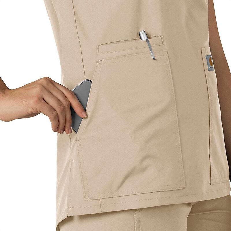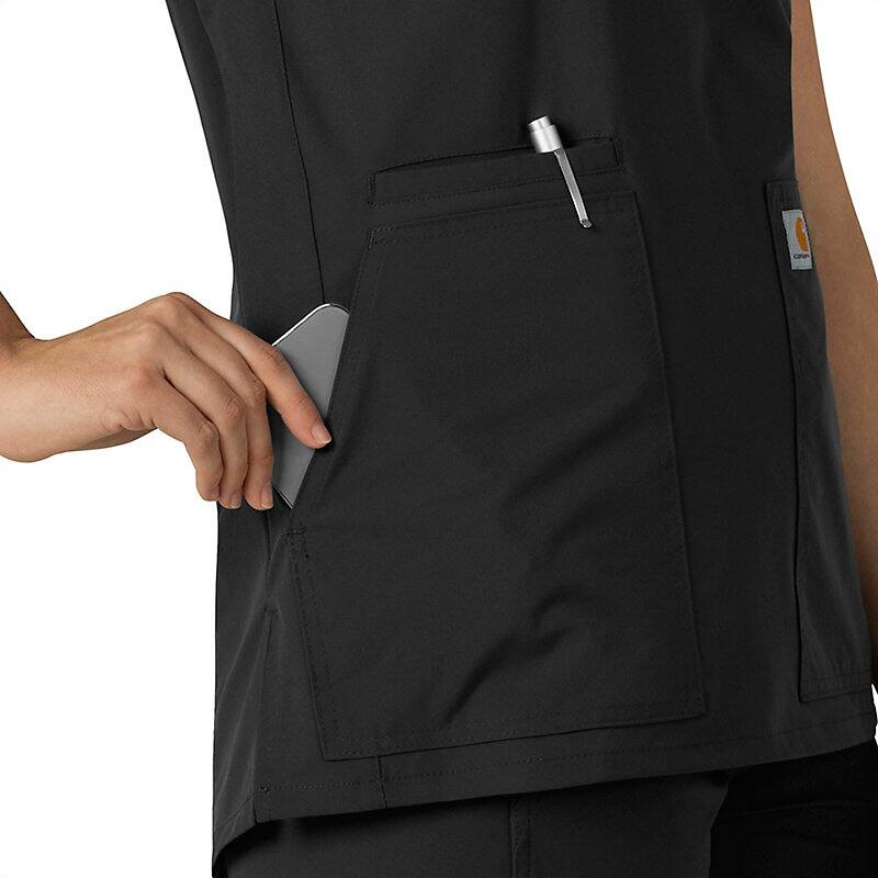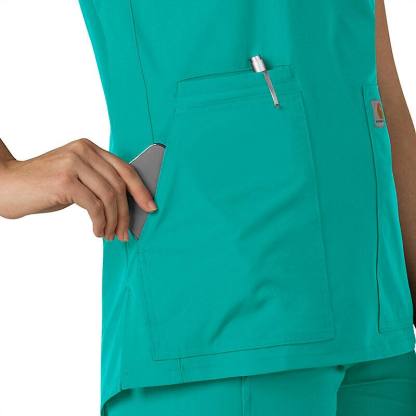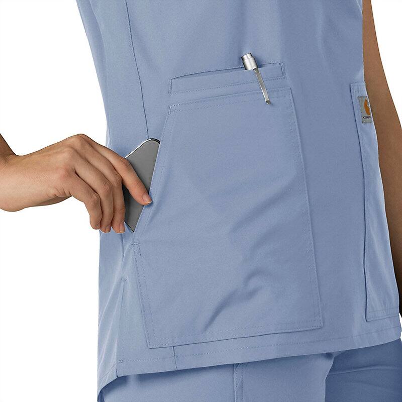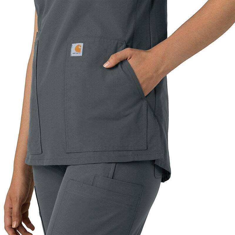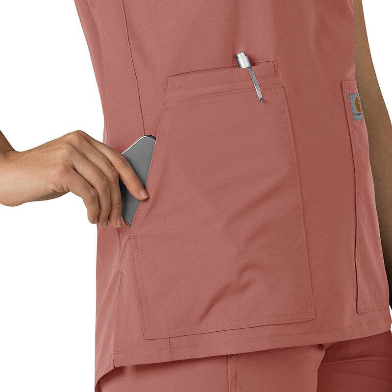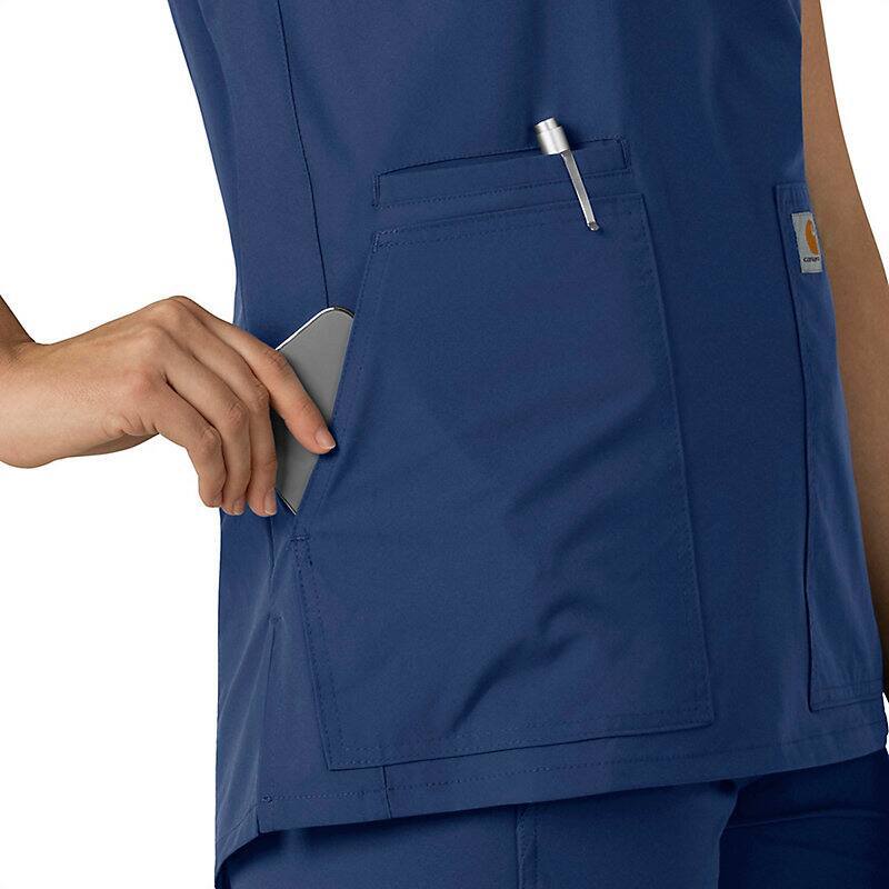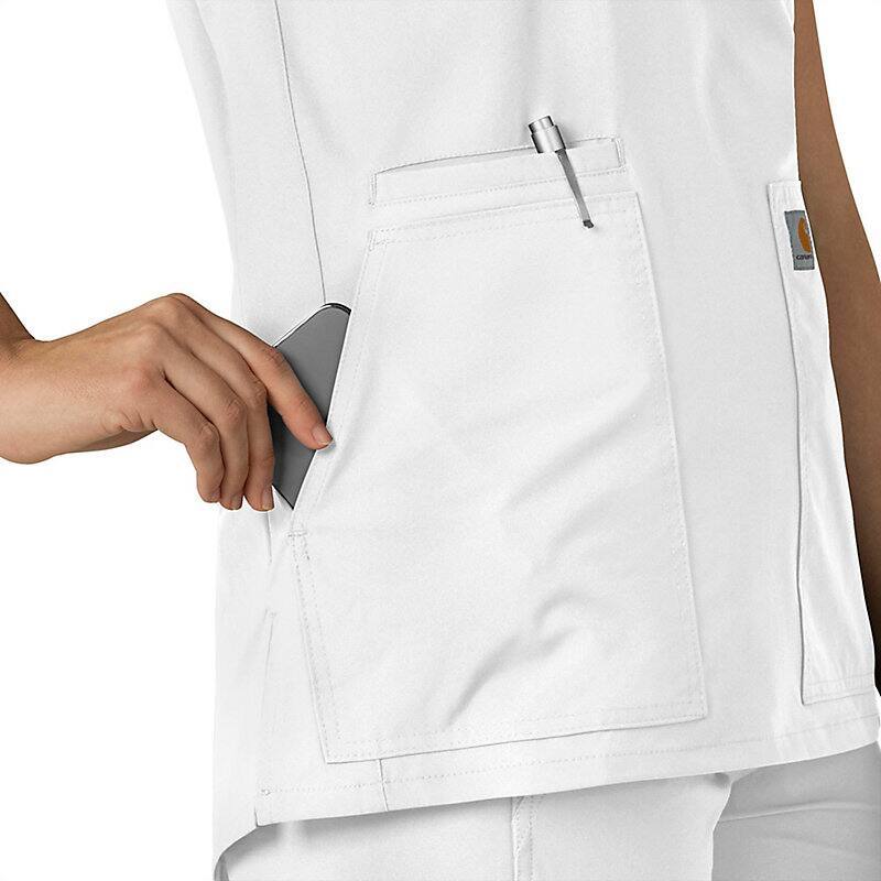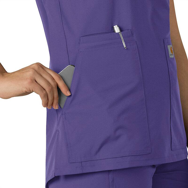 Keep all the things you need for a busy shift close at hand with this women's scrub top. The polyester-blend fabric has built-in flex so you can maneuver through small spaces or reach for supplies with ease. A cell phone pocket and earbud holders give you easy access to your electronics.