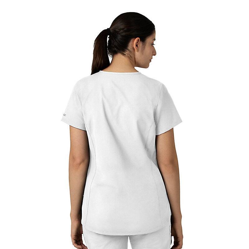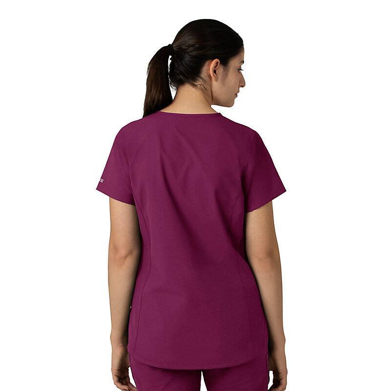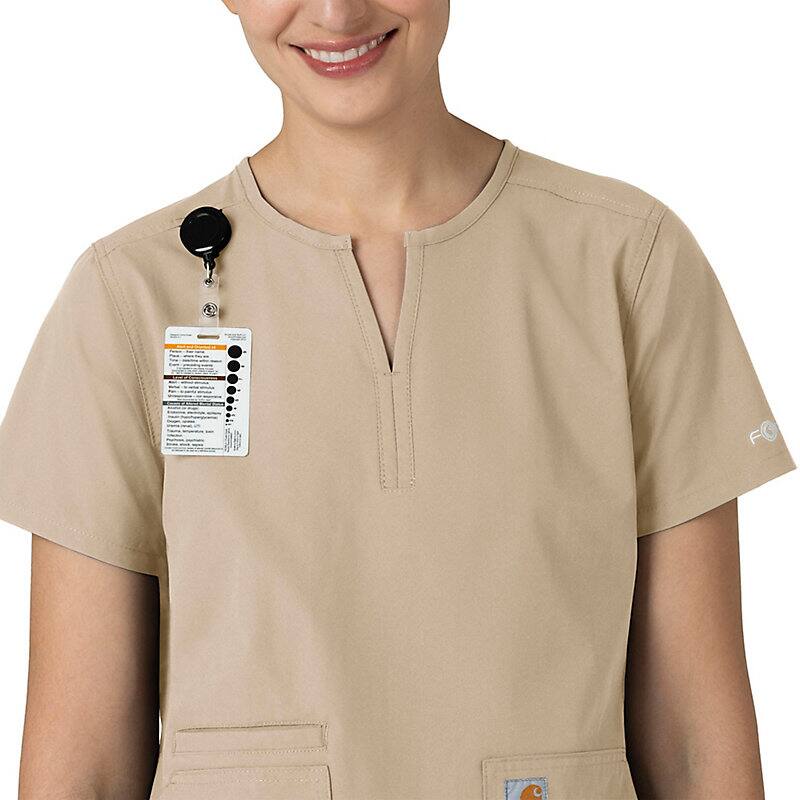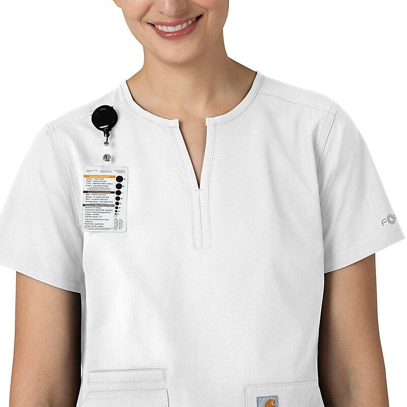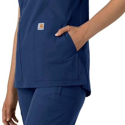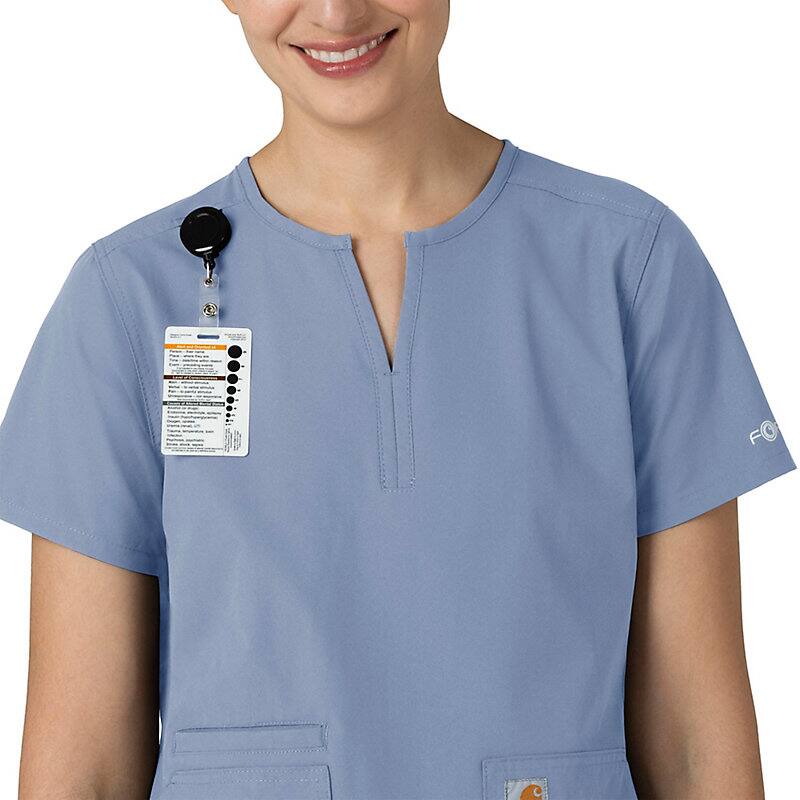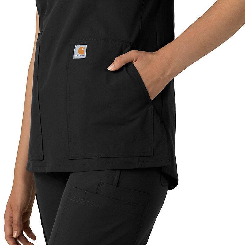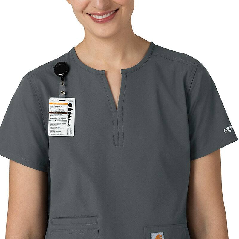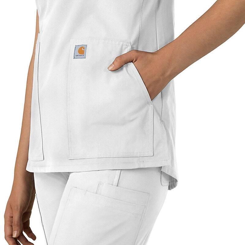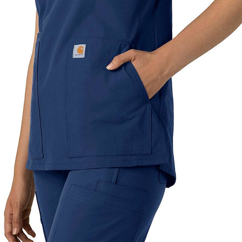 Keep all the things you need for a busy shift close at hand with this women's scrub top. The polyester-blend fabric has built-in flex so you can maneuver through small spaces or reach for supplies with ease. A cell phone pocket and earbud holders give you easy access to your electronics.