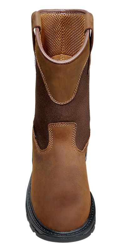 These women's waterproof boots are made for hard work in hard rain. They come equipped with a waterproof membrane that keeps out rain and mud but allows heat and sweat to escape. A Carhartt Ironwood outsole is slip resistant and meets ASTM F3445-21 SR standards to help protect against slips, trips, and falls. Alloy safety toe is made from blended metal and aluminum resulting in a thin lightweight safety toe for strength and comfort all day. It also meets ASTM 2413-18 standards.