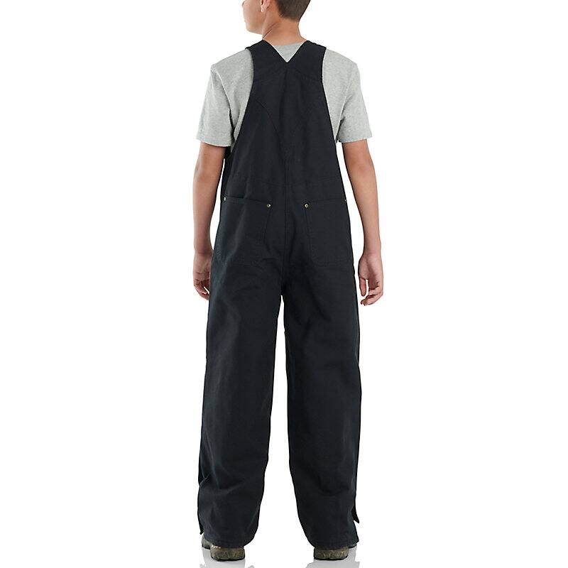 Hard-wearing gear for hardworking kids. Made Carhartt tough from rugged cotton canvas, these kids' triple-stitched washed bib overalls are built to handle every job. They have a quilted lining for added comfort, plenty of pockets, leg zips, and shoulder straps that adjust as boys grow.