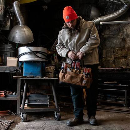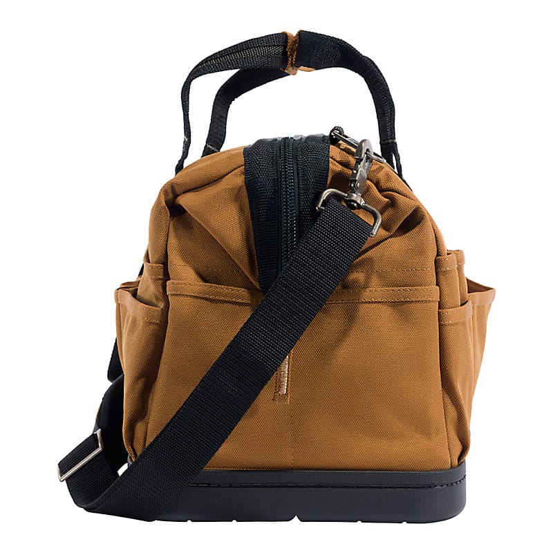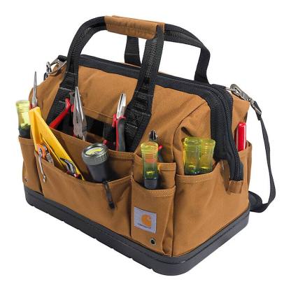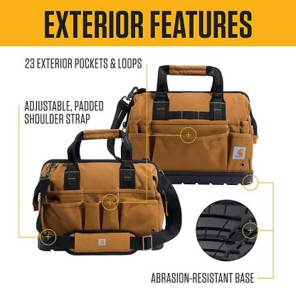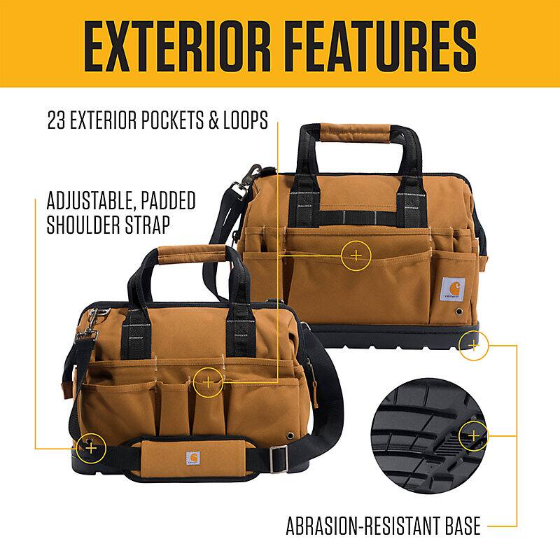 Find what you need when you need it. This tool bag keeps your gear in line with a durable design featuring 34 total pockets and loops. It's made of heavy-duty material that shrugs off light rain, with an abrasion-resistant base. The 16-inch main compartment has a metal frame, so you can find the right tool without digging around.