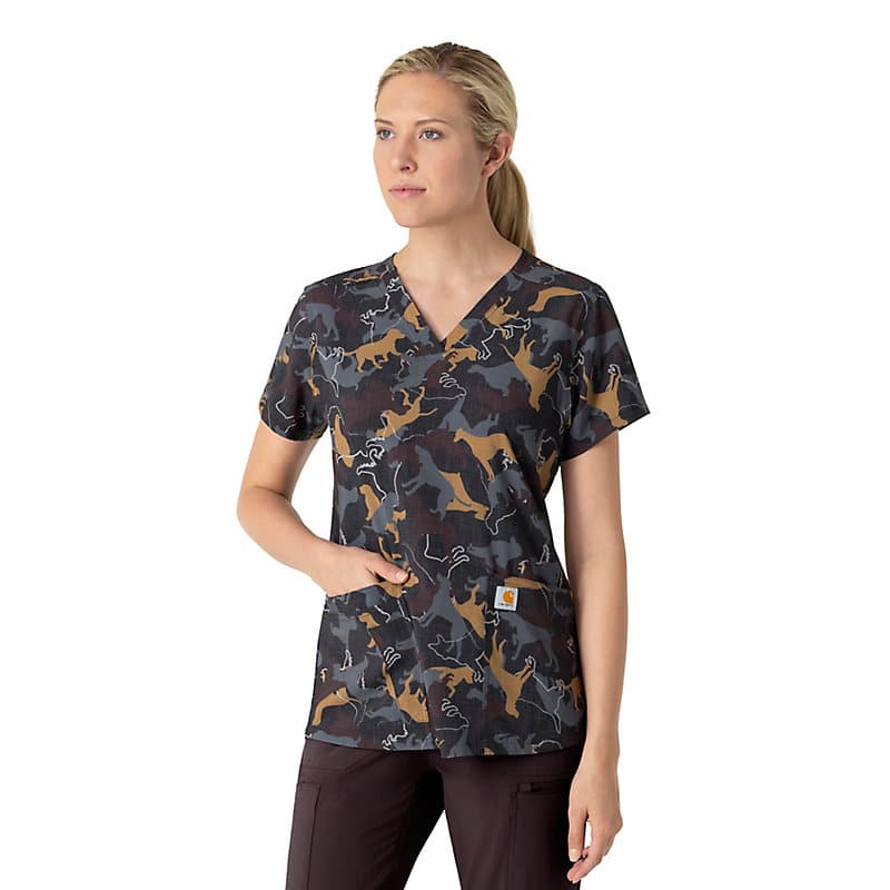 The Carhartt Women's V-Neck Print scrub top stays with the trend offering new and exciting prints scrub tops. This style offers all of the extras you expect from Carhartt with rugged durability yet a comfortable scrub top from a brand you can trust. The Polyester blend fabric offers lasting comfort and style while the pockets keep you organized and prepared for the task at hand.