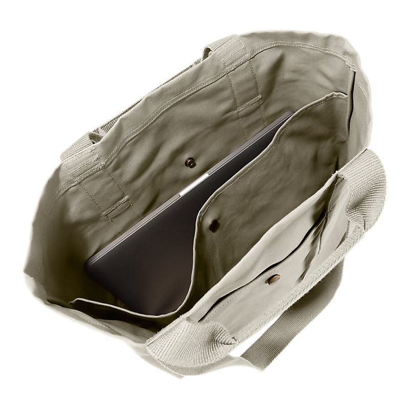 This tote is made of firm duck, our strongest cotton duck. Its utilitarian design makes it ideal for everything from trips to the hardware store to weekends at the campsite. The coated interior makes cleanup easy.