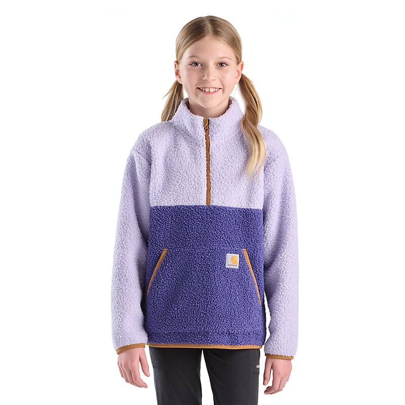 Every girl needs a reliable mid-layer to keep warm and cozy when playing outside or on the go. This girls' long-sleeve sweatshirt from Carhartt is made from sherpa fleece with a quarter-zip neckline for easy on and off. It has a front pouch pocket for stashing treasures and elastic binding around the cuffs and hem.