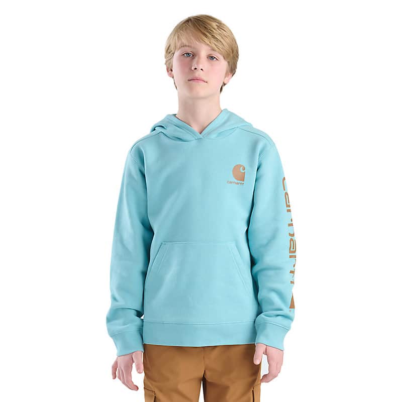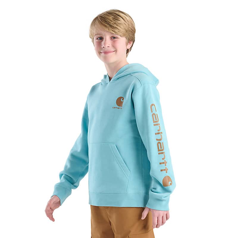 Boys of all ages will dig this long-sleeve sweatshirt's cozy warmth and workman style. Made from fleece with all the durability and dependability you expect from Carhartt, this pullover has a full hood for extra coverage and a big front pocket for stuff.
