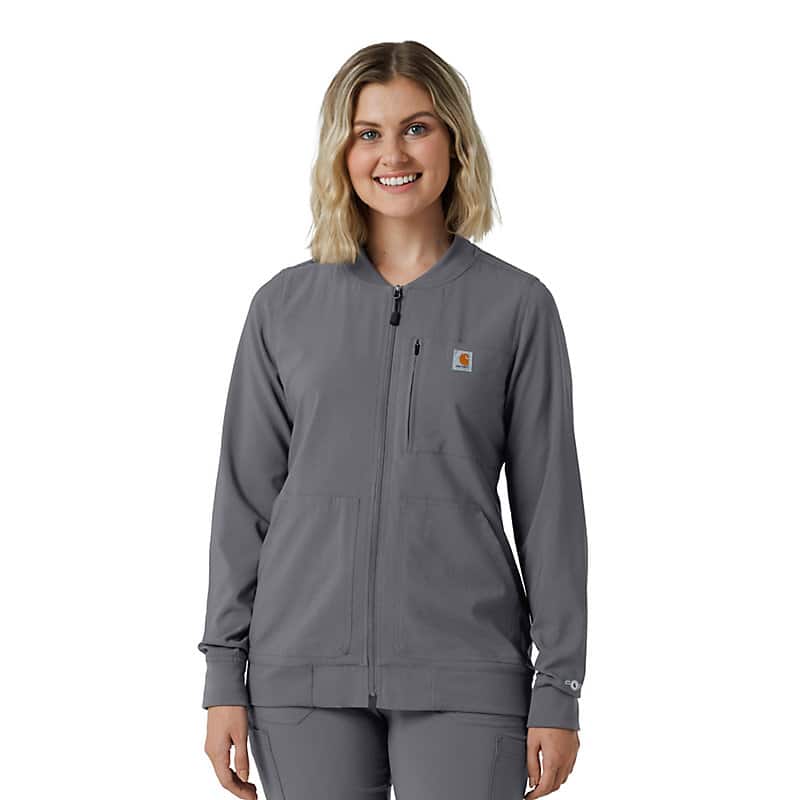 This women's Carhartt scrub jacket is a unique blend of classic workwear style and healthcare-specific functionality. At first glance, it resembles a traditional work jacket, but it's engineered to meet the unique demands of medical professionals. The Rugged Flex™ stretch fabric provides exceptional flexibility, allowing for unrestricted movement during busy shifts and demanding tasks. Functionality is a key focus, with a multitude of pockets strategically placed to keep essential tools and personal items organized and accessible. Notably, a dedicated stethoscope pocket ensures this crucial instrument is always within reach. The mesh-lined back vent promotes airflow, keeping you cool and comfortable even during long and strenuous periods. This jacket is designed to provide both durability and comfort. The robust construction ensures it can withstand the rigors of daily wear, while the thoughtful design div, such as the stretch fabric and ventilation, enhance overall comfort and performance. It's a reliable and practical choice for any healthcare professional seeking a durable and functional scrub jacket that can keep up with their demanding work environment.
