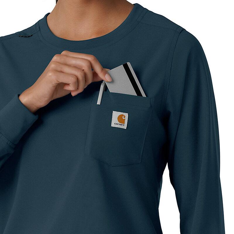 When you need a dependable layer for demanding workdays, this women's Carhartt long sleeve scrub top delivers. Designed for lasting comfort and functionality, it's a piece you'll consistently rely on. The durable fabric withstands the rigors of your shift, while the long sleeves provide added warmth and coverage. This scrub top is packed with practical features, including a zip pocket for storing small essentials. A dedicated pen slot ensures you're always prepared, and the badge loop allows for clear and visible display of your credentials. The knit collar and cuffs offer a comfortable, relaxed fit, adding a touch of casual style to your professional attire. This top seamlessly blends practicality with comfort, making it ideal for long hours on your feet. It's built to endure, ensuring you have a reliable and comfortable option for your daily workwear. The thoughtful design div and durable construction make this Carhartt long sleeve scrub top a valuable addition to any healthcare professional's wardrobe.