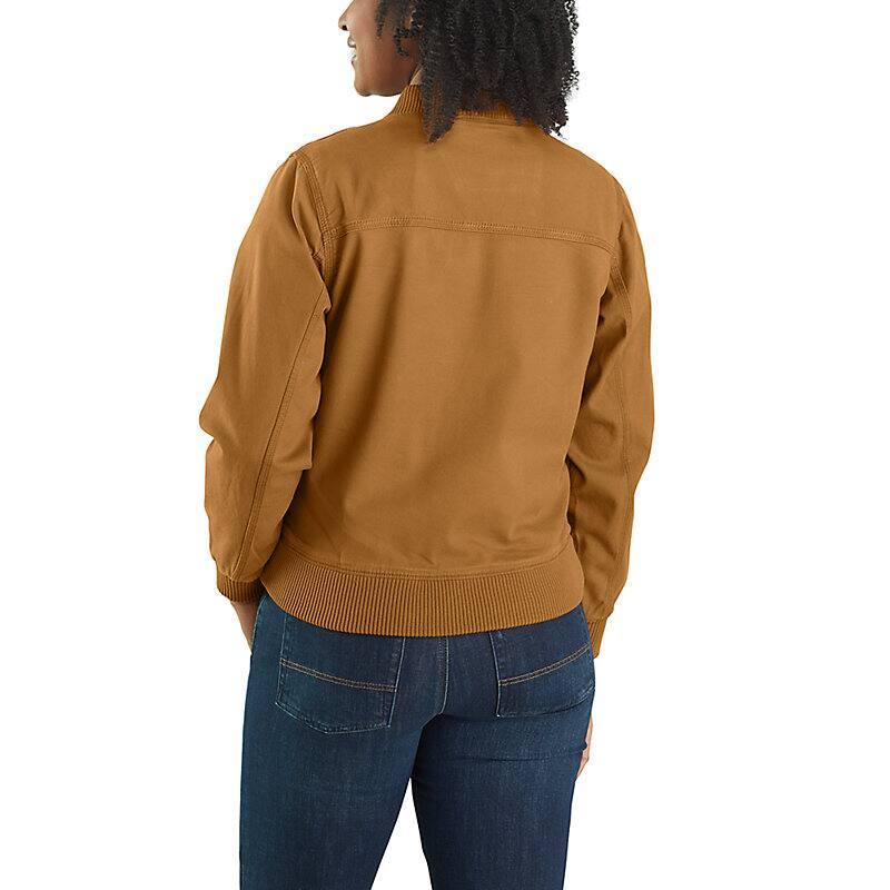 A classic women's bomber jacket done the Carhartt way. Mesh-lined canvas with enough stretch for you to move around easily throughout the day and a clean, classic style make this bomber jacket as functional as it is comfortable. Includes two large front pockets, a zip pocket on the chest, and rib knit collar, cuffs, and waist to help keep warmth in and cold out.