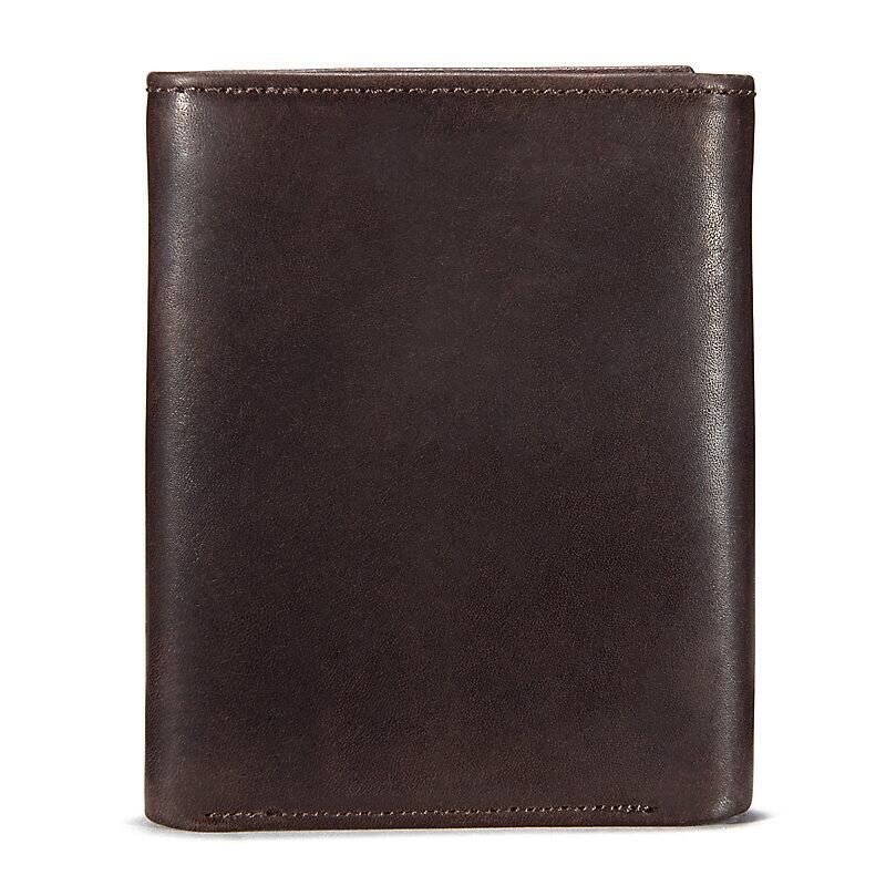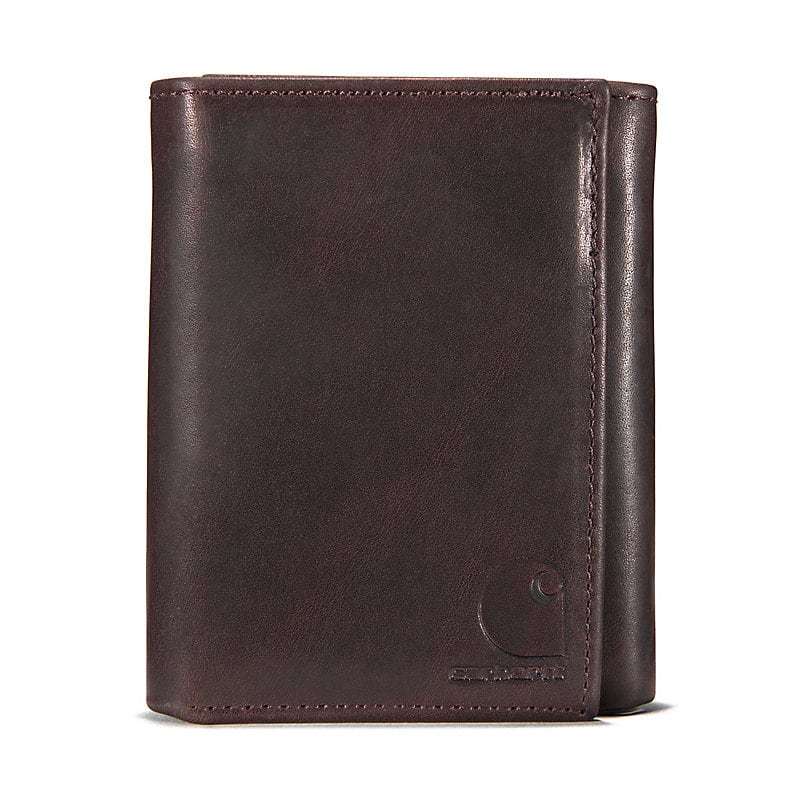 This men's trifold wallet has a simple, old-school design. It's made of durable full-grain leather with a rich oil finish that has a slight shine. An embossed Carhartt logo is its seal of quality.