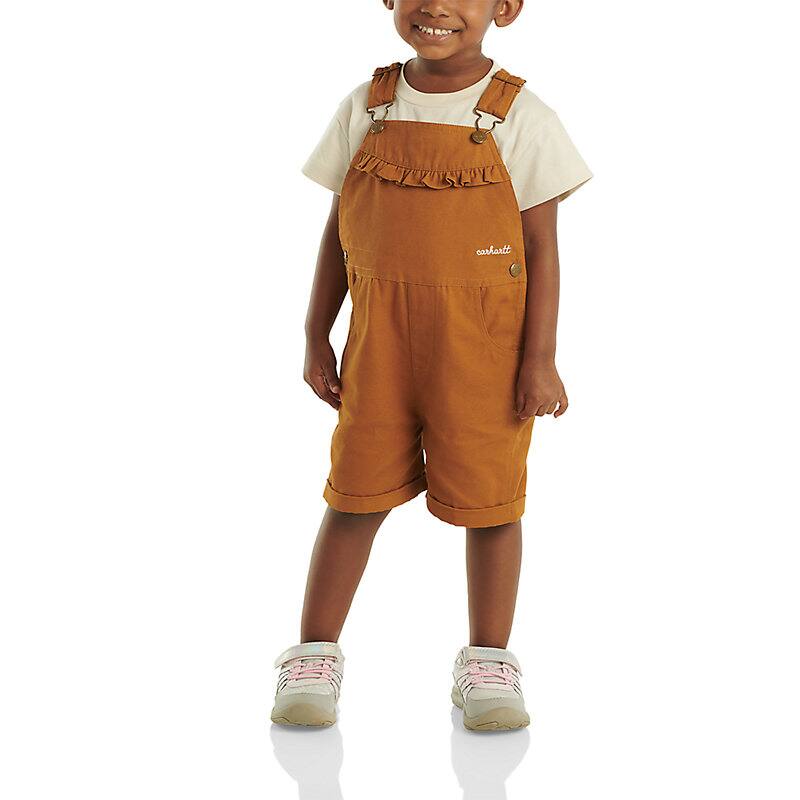 Kids' Carhartt bibs are built durable, so expect to hand these down to the next girl in the family. These baby girls' shortalls have a classic look in canvas. They get a girly twist from a ruffle detail along the front. The straps are adjustable to change the fit as she grows.