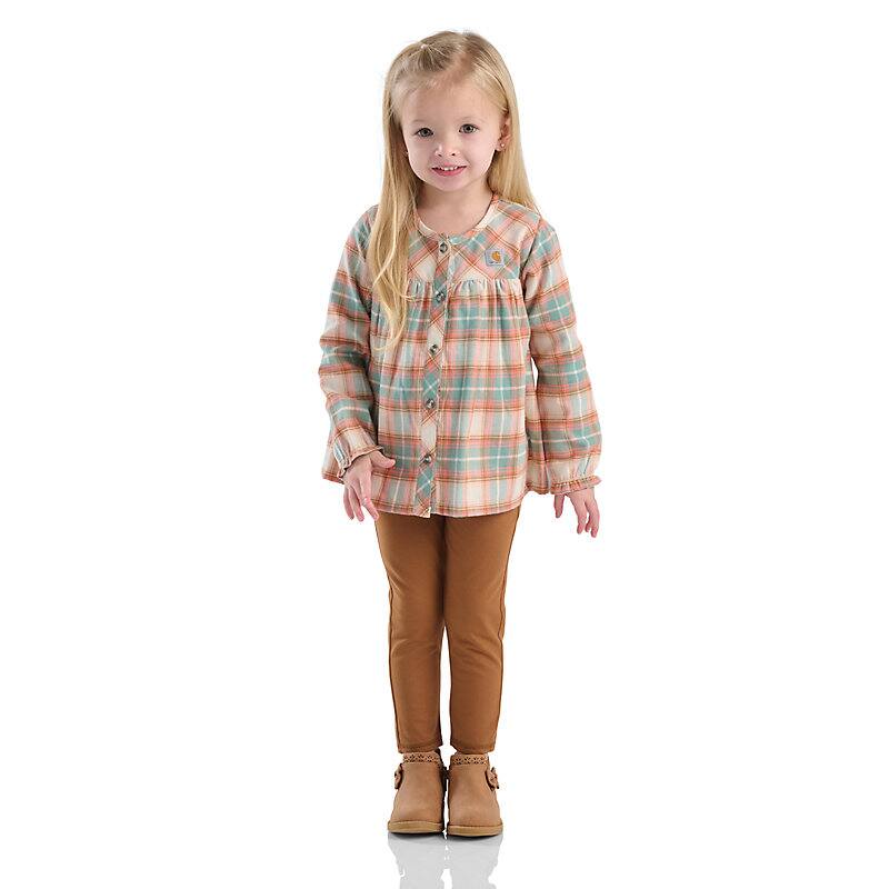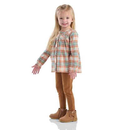 Carhartt tough has never looked so downright adorable. This toddler girls' set includes a top made of yarn-dyed flannel and stretchy cotton leggings. Both pieces are durable enough for rough-and-tumble play but gentle on her skin.