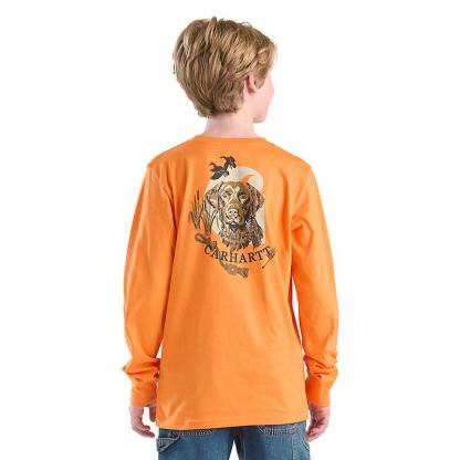 The best shirts feel better with every wear. This boys' long-sleeve pocket t-shirt has all the makings of a favorite. It's made with soft cotton fabric that's Carhartt tough and ready for anything. It's got an easygoing fit that resists twisting and a tagless neck label.